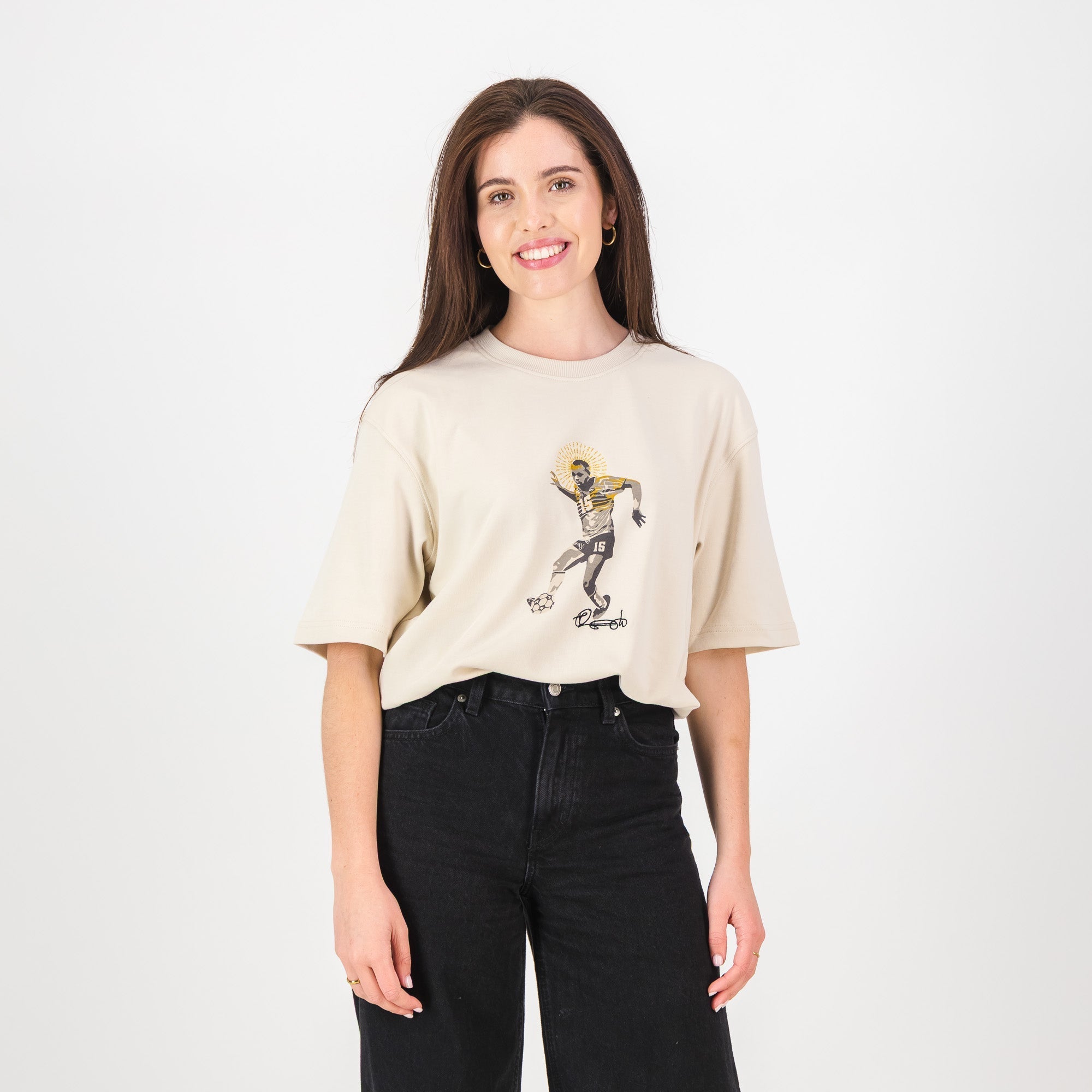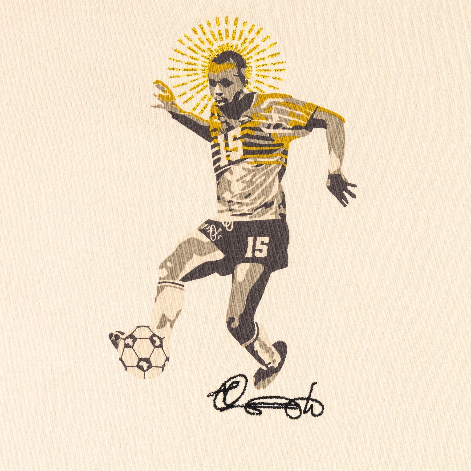Celebrating one of South Africa’s football greats, this boxy-fit crewneck tee is crafted from 100% cotton interlock for a structured yet comfortable drape. The front features a striking embroidery and pigment discharge print of Doctor Khumalo in action a tribute to timeless sporting heritage.