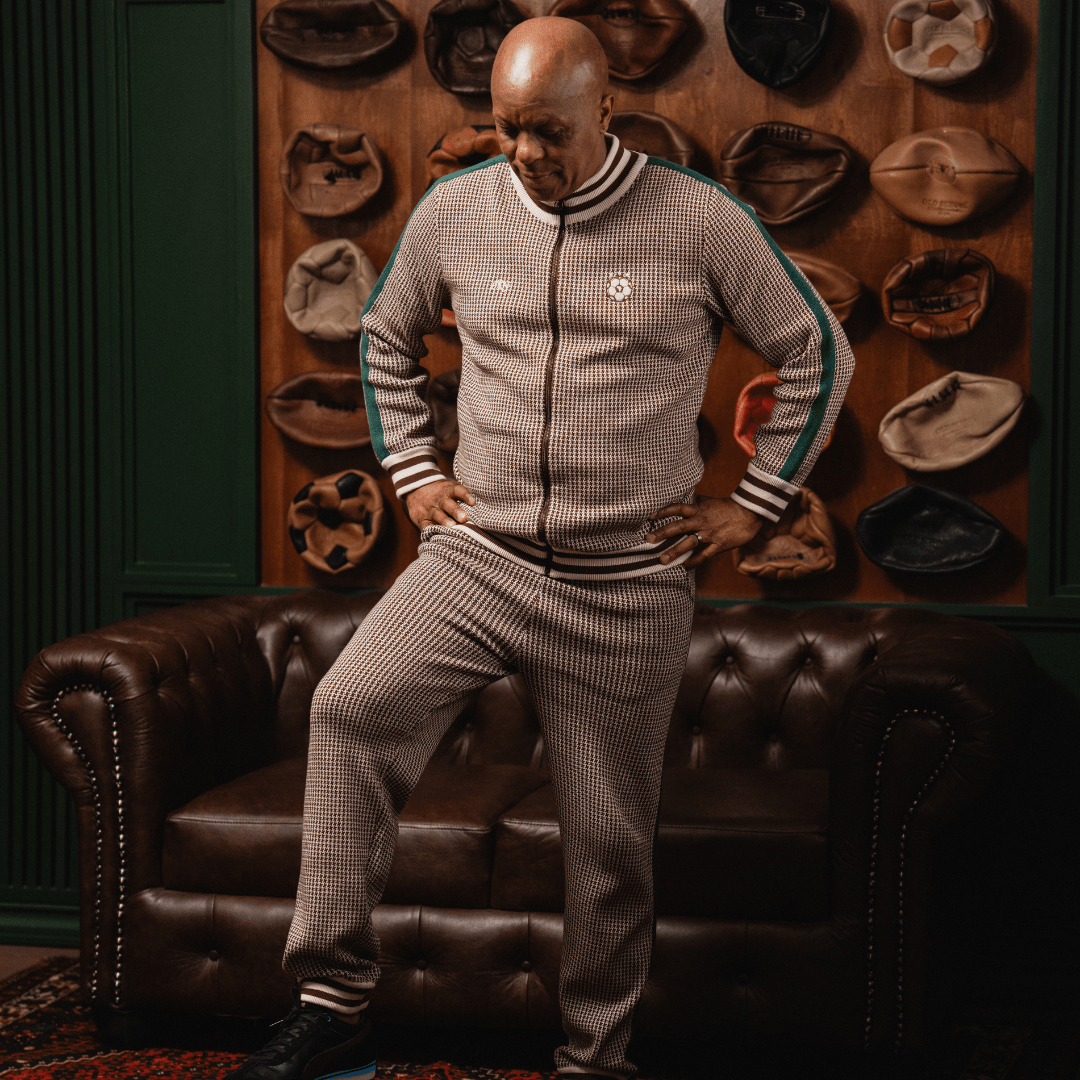 Crafted from a 100% cotton houndstooth knit, these premium jogger-style track pants combine heritage sportswear with modern comfort. Designed with contrast green knit panels running down the sides and finished with two-tone rib detail at the waistband and cuffs. Subtle branding comes through with a DK15 embroidery just below the waistband on the wearer’s left side, paying tribute to a football icon.