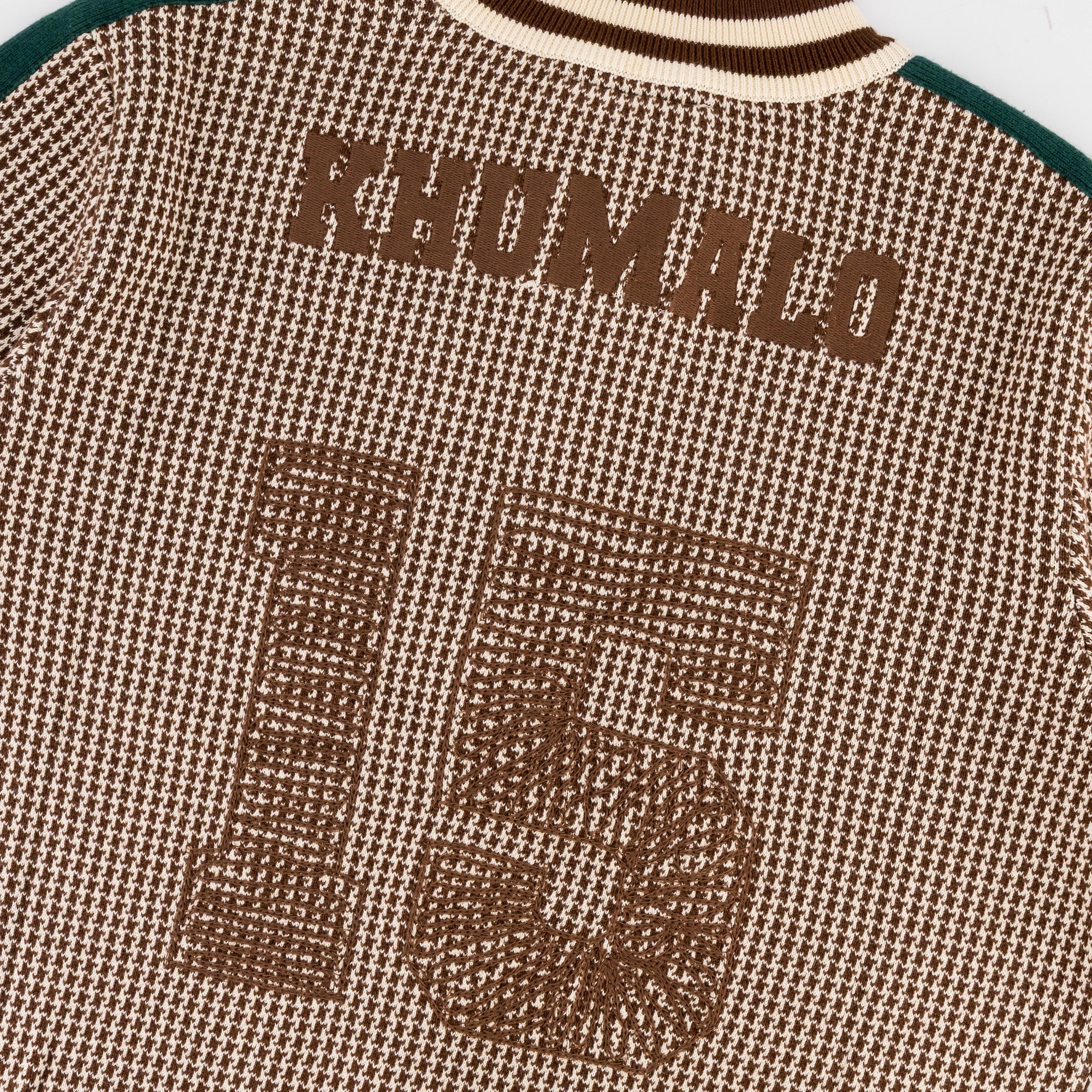 Crafted from a 100% cotton houndstooth knit, this premium zip-through jersey is a tribute to timeless football heritage. Featuring a branded DK15 ingot puller on the centre-front zipper, the design is elevated with an embroidered soccer ball on the wearer’s left chest and a bold DK15 embroidery on the right chest. The back is finished with Khumalo embroidered across the shoulders, complemented by a bold chain-stitch number 15 at the centre back. A piece that blends heritage styling with contemporary craftsmanship.